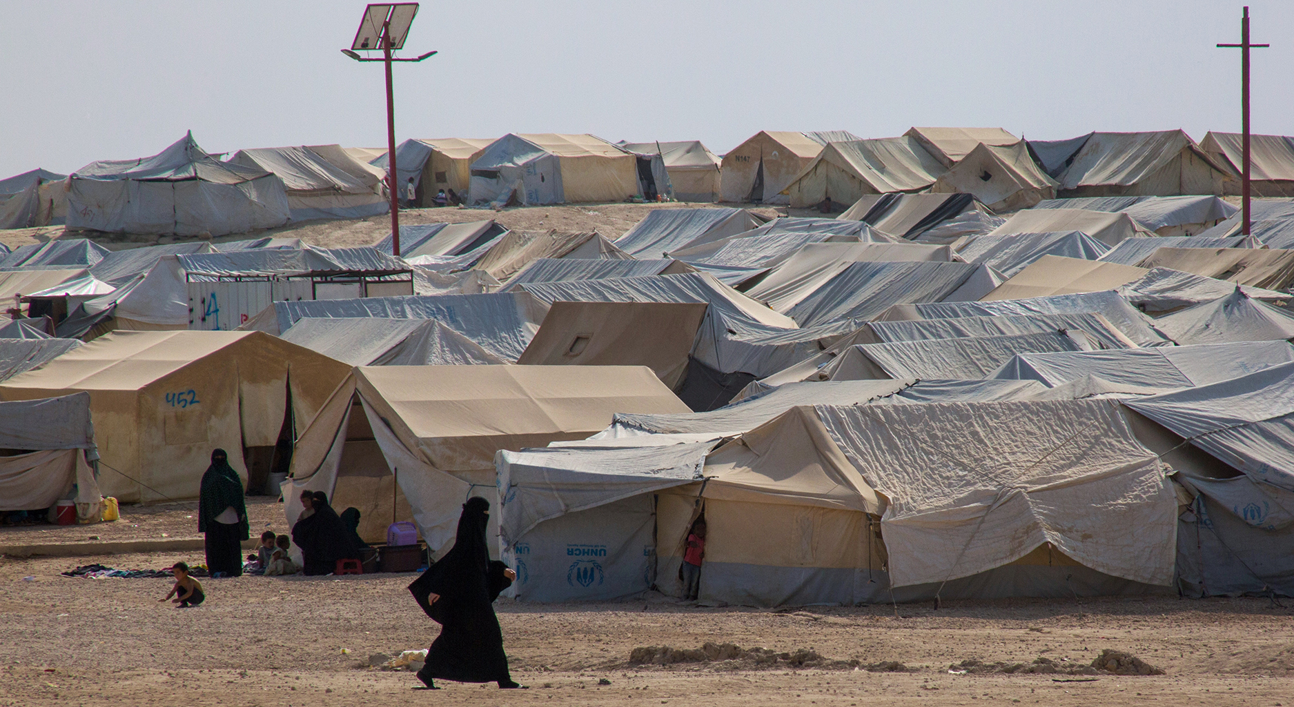 Camp made up of tents, a veiled person walks past in the foreground.