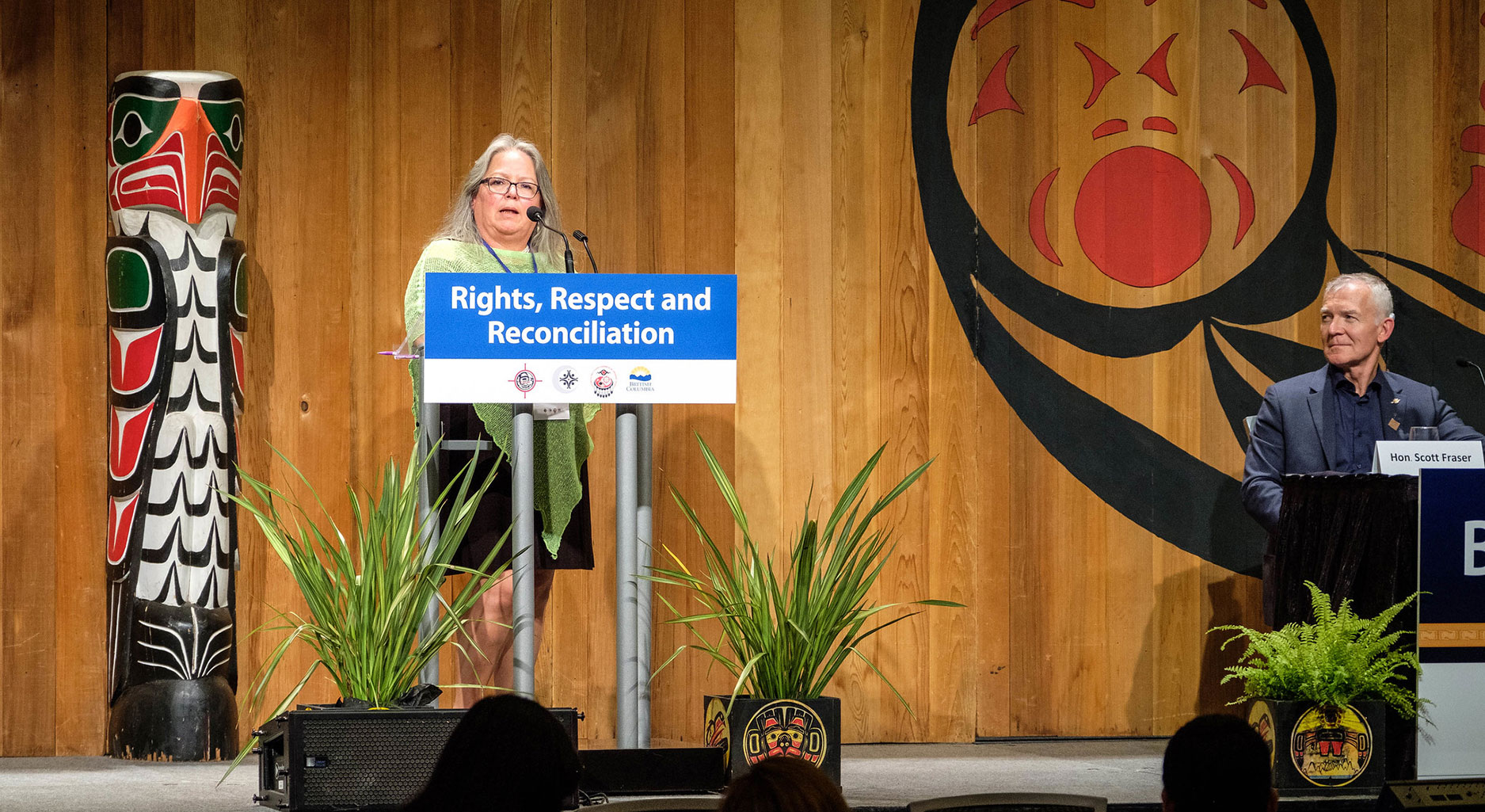 A woman stands on a stage with indigenous insigna behind her