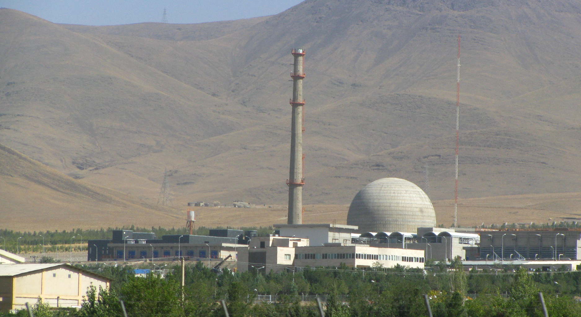 Foto des Reaktors in Arak, über einen Zaun hinweg fotografiert, im Hintergrund Gebirge